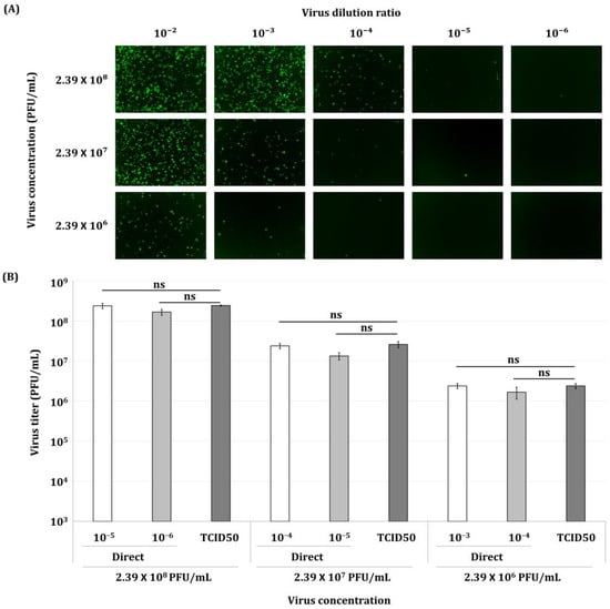 Figure 6. Fluorescence micrographs (A) of Sf9-QE cells infected with various concentrations of virus and virus quantification values (B) produced by the direct titration method. Sf9-QE cells at three days after subculturing were used. The virus, quantified as 2.39 × 108 PFU/mL by the end-point dilution assay involving the TCID50, was diluted 10-fold and 100-fold. Each virus inoculum was serially diluted and then inoculated onto the Sf9-QE cells. Fluorescence observations and cell counting were performed 24 h after virus infection. Virus titers determined by the end-point dilution assay involving the TCID50 (TCID50) and the direct titration method (Direct) were compared. The inoculum dilution ratios for each virus used for cell counting in the direct titration method are indicated from 10−3 to 10−6. Statistical significance was determined using a t-test (p < 0.05); ns (not significant, p ≥ 0.05).