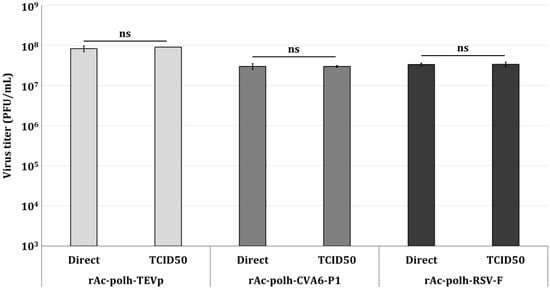 Figure 7. Quantitative titer values of various recombinant viruses produced by the direct titration method. The titers of recombinant viruses producing TEV-protease (rAc-polh-TEVp), CVA6-P1 (rAc-polh-CVA6-P1), and RSV-F proteins (rAc-polh-RSV-F) were determined and compared using the end-point dilution assay involving the TCID50 (TCID50) and the direct titration method (Direct). Statistical significance was determined using a t-test (p < 0.05); ns (not significant, p ≥ 0.05).
