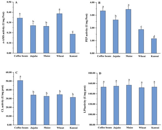 Procedures for the activity assays of each enzyme (α-AMS, LPS, PEP, and CL) were performed according to the manufacturer’s instructions for the relevant kits (Nanjing Jiancheng Bioengineering Institute, Nanjing, China). The optical density was recorded using a microplate reader (SpectraMax M2, Molecular Devices, San Jose, CA, USA). There were three repetitions for the activity assays of each digestive enzyme.
