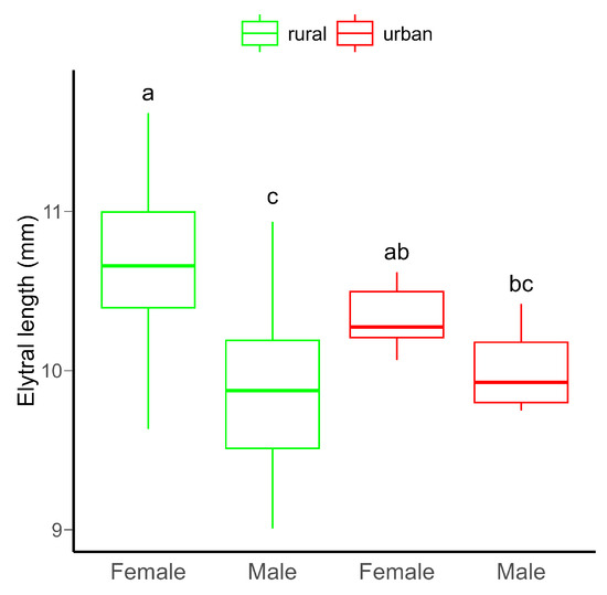 Boxplot of the elytral length (as proxy for body size) of C. convexus beetles sampled in rural and urban habitats. In boxplots, the horizontal lines represent median values, the boxes denote interquartile ranges, while whiskers show minimum and maximum values. Different letters indicate significant (p < 0.05) differences based on the Tukey test.