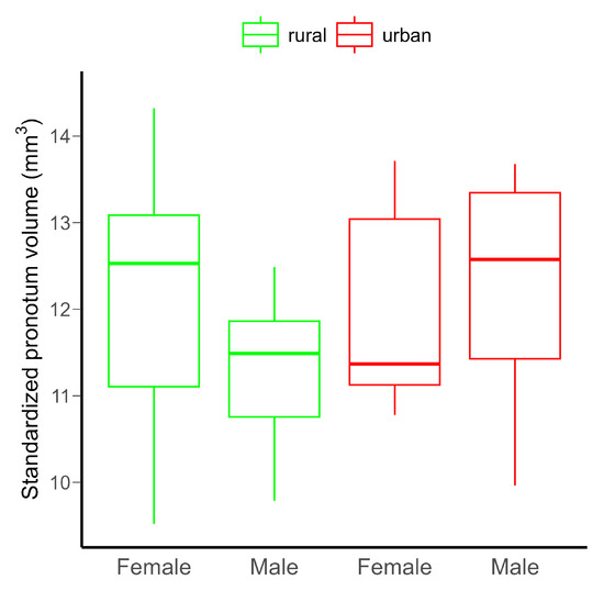 Differences in the standardized pronotum volume in C. convexus adults in rural and urban habitats. The horizontal lines indicate medians, and the boxes the interquartile ranges, with whiskers showing minimum and maximum values. There were no significant (p < 0.05) differences among groups.