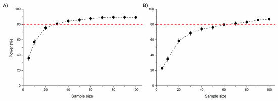 Statistical power (%) of linear mixed-effects models to detect the model-estimated differences (2.15% for tibia and 3.06% for femur) in the standardized tibia (A) and femur (B) area of the hind leg between rural and urban beetles. Sample size represents the number of beetles per sex (female or male) per area (rural or urban). Red dotted lines indicate the 80% power limit.