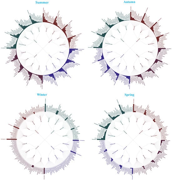 The PCA plot (Figure 5) efficiently demonstrates the distribution and clustering of different sites and species by utilizing their principal components. This provides a clear depiction of the main patterns and variations present in the present dataset. The fundamental sources of variance are shown by the two principal components on the X and Y axes. The relative similarities and differences between sites and species can be determined by their positioning on this plot. Three separate groups of sites are clearly visible, each contained within an ellipse (the first for summer, the second for autumn and the third for winter and spring together). These clusters represent groups of locations that share similar characteristics, as determined by the principal components. Winter–spring clusters exhibit a concentrated aggregation of sites with minimal deviation along both components, suggesting uniform conditions or species distributions within these sites. The summer cluster exhibits a wider distribution along component 1, indicating a diversity in species and environmental circumstances that are represented by this component. In contrast, the autumn cluster is more strict to component 2, with much less deviation than the summer cluster.