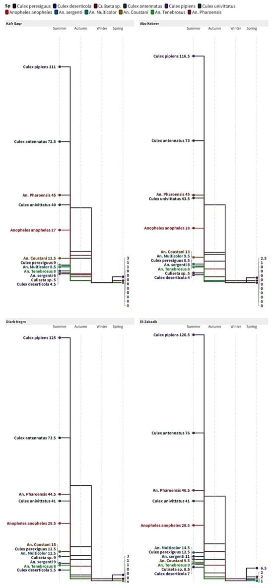 Insects are powerful and rapid adaptive organisms with high fecundity rates and short life cycles. Human interruption in agroecosystems and global climatic variations are disturbing the insect ecosystem. According to the present study conducted along the Sharkia Governorate, 12 mosquito species, namely, Cx. pipiens, Cx. antennatus, C.x univittatus, Cx. perexiguus, Cx. deserticola, Culiseta sp. An. coustani, An. pharoensis, Ano. tenebrosus, An. anopheles, An. sergenti and An. multicolor belonging to two genera were recorded in four stations (16 sites). The results are similar to those of [19,22,23]. The current study revealed that the species Culex pipiens was found to be the most abundant across the majority of locations; for example, in the summer, it reaches its peak in Al-Zankalon with a maximum count of 139 ± 7.61 individuals. C. antennatus exhibited a significant level of abundance (p < 0.001), especially in Al-Rahmania (82.5 ± 4.3). Species such as C. perexiguus and An. pharoensis were found in moderate to low numbers. According to the same context [9], the most abundant genus in the Fayum governorate was Culex, which had four species and accounted for 88.01% of all mosquitoes, while Anopheles had six species and represented 11.99% of all mosquitoes. The most abundant and dominant mosquito species was C. pipiens, which was followed by C. antennatus and C. bivittatus. The rarest mosquito species were An. multicolor and An. tenebrosus. Nine species from four genera were found in mosquitoes collected from the Beheira Governorate, according to another study [24]. Cx pipiens 36.57% (13830/37820), Cx. antennatus 18.83% (7121/37820), Cx. theileri 8.48% (3209/37820), Cx. tritaeniorhynchus 5.78% (2188/37820), Cx. Longiareolata 11.97% (4526/37820), Ae. caspius 7.57% (2863/37820), Ae. detritus 2.83% (1070/37820), An. multicolor 3.79% (1434/37820), and An. sergentii 4.18% (1579/37820). Additionally, [25] found that the most abundant species were An. pharoensis, C. pipiens, C. antennatus, C. univittatus, and An. coustani. In every kind of breeding habitat, C. pipiens and Cx. antennatus were discovered. According to Sharkia [26], rice fields were plentiful, and Cx. pipiens larvae accounted for 83.4% of all larvae collected during the year. The larvae also preferred wells and cesspits. Similarly, at Giza, it was discovered that Cx. pipiens was the most prevalent mosquito species, accounting for 97.95 percent of all species [27]. The larvae were found in all breeding locations, particularly in seepage, canals, drains, cesspits, and wells. Also, [28] found that Cx. pipiens was the most common mosquito species in Gharbia. While [29] in Mansoura discovered that Cx. univittatus, Cx. antennatus, and Ae. caspius were the most prevalent, Cx. deserticola was the least common, and neither Cx. pipiens was found in rice fields, sewage wells, or drains. Cx. antennatus is only found in rice fields, and only a small portion was in a canal of Mansoura center. In four Egyptian governorates, Cx. pipiens and Cx. antennatus were the predominant species, according to a three-year study [30].