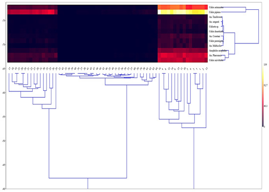 The heatmap (Figure 4) depicts the spatial and temporal distribution of diverse locations, revealing distinct patterns in the data. The dendrograms displayed at the top and left of the heatmap depict the hierarchical grouping of sites, providing insights into the linkages and similarities in their mosquito abundance. Clusters of sites with similar features indicate that specific locations or species exhibit consistent patterns of activity or abundance throughout several seasons. The presence of distinct clusters suggests that some locations exhibit elevated abundance under specific circumstances, which are depicted by lighter hues ranging from yellow to red. Conversely, lower values are visualized by darker shades, ranging from black to dark red. This pattern indicates that certain species exhibit higher levels of activity or population density in distinct geographical regions and time periods. The heatmap provides a clear and informative visualization of the hierarchical relationships and seasonal patterns of distinct locations. It also offers useful insights into the distribution and behavior of species across various regions and throughout different times of the year.