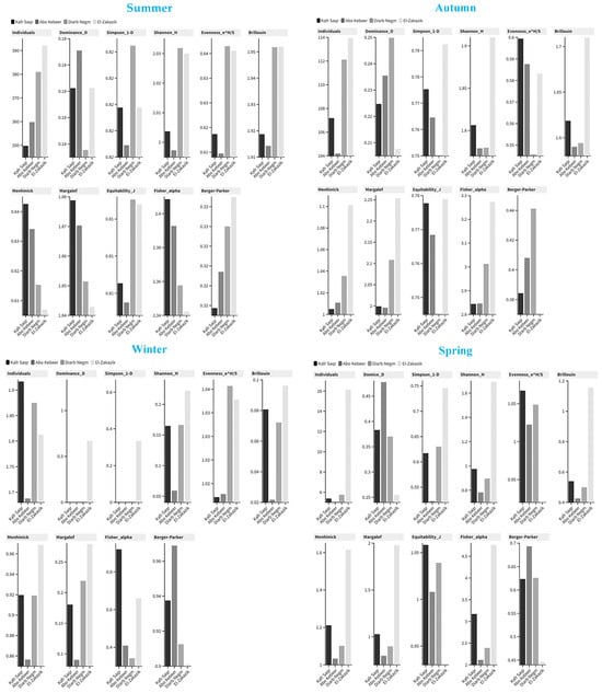 Through autumn, there is a drop in the number in all regions, with El-Zakazik once again having the highest recorded individual index of 113.93 ± 9.445. The level of Dominance_D exhibits a minor increase, particularly in Diarb Negm (0.24 ± 0.014), suggesting a greater dominance by a smaller number of species. The Simpson_1-D index reaches its peak in El-Zakazik (0.79 ± 0.004), indicating a higher level of diversity. This is further supported by the ANOVA analysis, which reveals significant differences (p value = 0.003). The Shannon_H index in El-Zakazik is much higher at 1.91 ± 0.024, as indicated by the significant ANOVA results (p value = 0.002). The level of evenness in Diarb Negm stays quite stable, although there is a minor drop. The Fisher_alpha index, which measures species diversity, is highest in El-Zakazik with a value of 3.27 ± 0.072. The ANOVA test reveals that there are significant regional differences, with a p value of 0.000. The Berger-Parker index indicates that Diarb Negm has the highest level of dominance, with a value of 0.44 ± 0.021 (Table 2 and Figure 6).