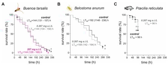 Survival rate of Buenoa tarsalis adults (A), Belostoma anurum second instar nymphs (B), and Poecilia reticulata adults (C) when subjected to diflubenzuron exposure. Treatments with the same letter do not differ, according to HolmSidak’s test (p > 0.05). LT50 = median lethal time (hours).