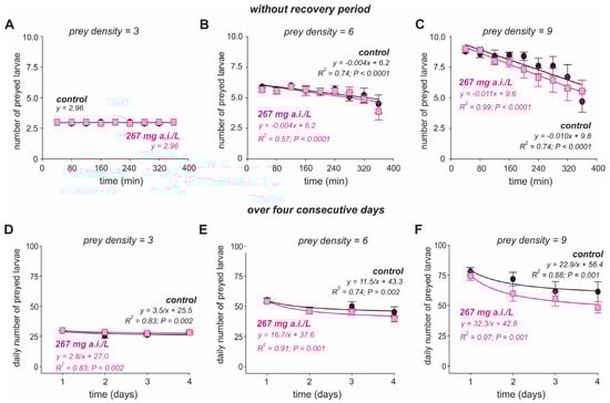 For the exposure time of 24 h, our analysis of variance with repeated measures revealed that the insecticide (F(1,2) = 0.69, p = 0.41) and its interactions with larval density (F(1,4) = 0.38, p = 0.69), with time (F(16,220) = 0.61, p = 0. 76), and with larval density and time (F(32,407) = 0.63, p = 0.85) did not affect the number of larvae consumed by the Bu. tarsalis (Table 1, Figure 2A–C). However, the number of larvae consumed by Bu. tarsalis was affected by the larval density (F(1,2) = 157.9, p < 0.0001), by time (F(8,110) = 6.95, p < 0.0001), and by the interaction between time and larval density (F(16,220) = 3.88, p < 0.0001) (Table 1, Figure 2A–C). When faced with the prey density of three larvae, Bu. tarsalis consumed approximately three larvae over time (Figure 2A). The number of larvae consumed by Bu. tarsalis reduced in a similar manner for diflubenzuron-unexposed and -exposed individuals in densities of both six (Figure 2B) and nine larvae/100 mL (Figure 2C).