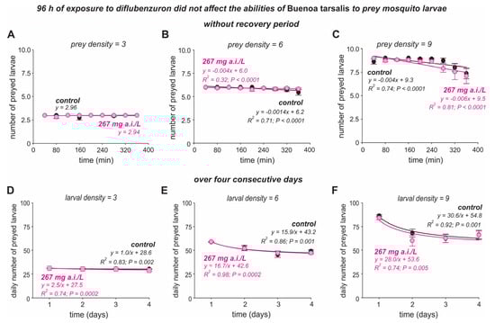 As shown in the 24 h exposure period, the abilities of Bu. tarsalis exposed to diflubenzuron for 96 h to prey on mosquito larvae were not affected just after the exposure period (Figure 3A–C) or over four consecutive days (Figure 3D–F). At the end of four days, there were no significant differences between the total number of larvae preyed on by Bu. tarsalis untreated and treated with diflubenzuron for all larvae densities (Supplementary Figure S1).