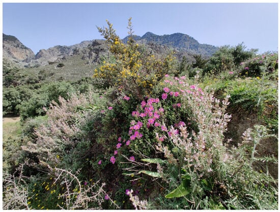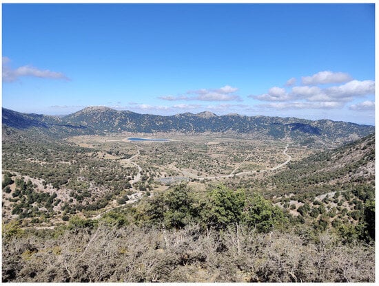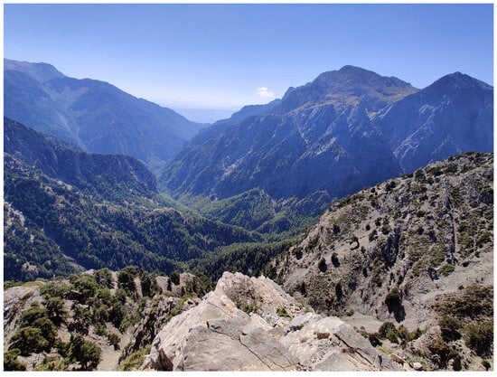 The Cretan landscape is dominated by “phrygana” (sensu [3]), “maquis” (mainly Quercus coccifera), and intermediate mosaic formations, in addition to subalpine shrubs. Phrygana comprises spiny, aromatic shrubs with brief lifespans, superficial roots, limited palatability, and resilience to drought and grazing. Examples include Calicotome villosa, Sarcopoterium spinosum, Thymus capitatus, and Genista acanthoclada. Cypress (Cupressus sempervirens), pines (Pinus brutia), and oak forests (Quercus coccifera, Q. ilex) also exist, mainly on mountain cliffs (Figure 1, Figure 2, Figure 3 and Figure 4). Lowland shrublands reach the alpine zones, confirming the weak zonation of Crete’s vegetation [4]. Crete’s unique orography and its long-standing isolation from the mainland—during glacial maxima, the sea level was 200 m lower than at present [5], yet Crete remained isolated from the Cyclades and Peloponnese, as the Cretan Sea is much deeper [6]—have contributed to an impressive level of endemism. This is especially well documented in vascular plants, with 223 endemics, encompassing about 10% of the entire flora [7,8], but also in many other groups of organisms, including even vertebrates such as Crocidura zimmermanni and several extinct species from the Holocene [6].