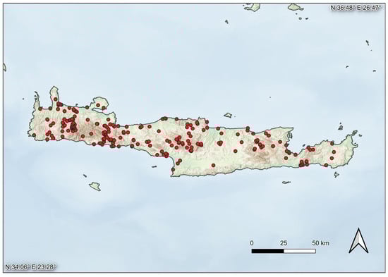 Crete, with an area of 8261 km2, is the largest Greek island, located in the eastern Mediterranean Sea, south of the mainland. Crete’s topography is marked by mountainous landscapes, with three notable mountain ranges exceeding 2000 m: the Lefka Ori (White Mountains), Idi (Psiloritis), and Dikti. These ranges significantly impact the island’s Mediterranean climate, creating varied precipitation levels across Crete. Aridity levels generally increase from west to east and from north to south across the island [1]. The annual precipitation varies from 240 mm in the southeastern region to 2000 mm in the White Mountains. The temperature typically drops 6 °C per 1000 m. Above 1600 m, the precipitation is mostly snow, which accumulates from late October to May, sometimes extending to July in Lefka Ori [2]. Crete’s high mountains, mainly composed of limestone, surround the main island. In addition, extensive agricultural land and intensive touristic utilization of coastal areas are particularly prominent along the northern shoreline, whereas the southern regions remain comparatively undisturbed and close to their natural state. The coast also has 36 offshore islets, varying in geology and drier than the mainland.