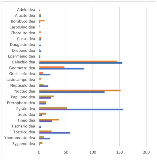 These BINs belonged to 21 of the 24 superfamilies from Crete (Figure 6). The Pyraloidea, Gelechioidea, Noctuoidea, and Geometroidea not only have the highest species numbers but also show particularly good BIN coverage. Currently, no BINs are available for three species-poor superfamilies (Carposinoidea, Choreutoidea, Lasiocampoidea).