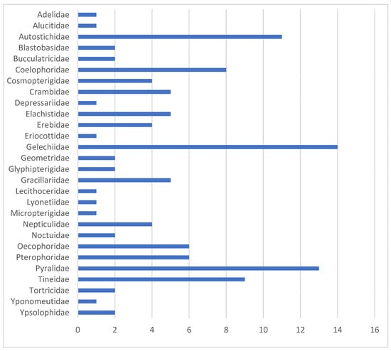 The unassigned BINs are distributed very unevenly across major taxonomic groups (Figure 7). Among the 27 families with unknown BINs, the Gelechiidae are particularly well represented, with 14 BINs, followed by the Pyralidae with 13 BINs and the Autostichidae with 11 BINs. Additionally, Pterophoridae, Tineidae, and Coleophoridae each contain more than five BINs lacking a species assignment. In seven predominantly species-poor families, only a single BIN that could not be classified at the species level was recorded. For all of these taxa, extensive morphological studies are required to ultimately assign BINs to Linnaean names.