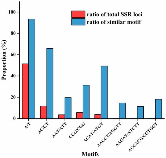 The dominant A/T motif in mononucleotides numbered 12,907, constituting 51.38% of the total SSR loci and 93.46% of mononucleotide SSRs. The dominant AC/GT motif in dinucleotides numbered 2949, representing 11.74% of the total SSR loci and 65.90% of dinucleotide SSRs. The number of SSR loci with the major CCG/CGG motif in trinucleotides was 1432, accounting for 5.70% of the total SSR loci and 31.36% of trinucleotide SSRs. The dominant ACAT/ATGT motif in tetranucleotides numbered 960, constituting 3.82% of the total SSR loci and 49.38% of tetranucleotide SSRs. Among pentanucleotide repeat motifs, the dominant ones were AACCT/AGGTT and AAGAT/ATCTT, numbering 26 and 20, and accounting for 0.103% and 0.08% of the total SSR loci, respectively. The number of SSR loci with the dominant ACCACG/CGTGGT motif in hexanucleotides was 27, contributing 0.107% to the total SSR loci (Table S2, Figure 1).