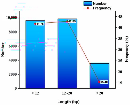 The length of the SSR motif exhibited a positive correlation with polymorphism. Analysis of the T. absoluta transcriptome data revealed that the SSR motif lengths were primarily distributed within the range of 10–20 bp (Figure 2). SSRs with lengths of less than 12 bp numbered 9642, representing 41.75% of the total SSR loci. SSRs with lengths ranging from 12 to 20 bp totaled 9897, accounting for 42.85% of the total SSR loci. SSRs with lengths exceeding 20 bp were 3556 in number, constituting 15.40% of the total SSR loci.