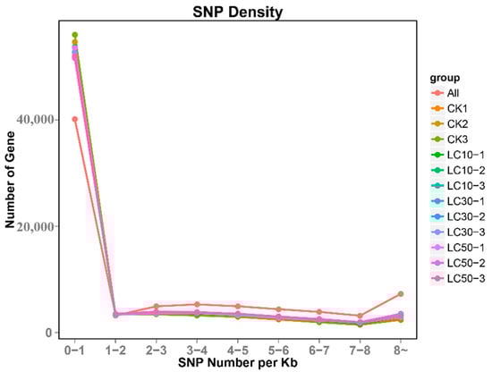 The analysis of SNP loci showed that there was a total of 332,537 SNP loci in the 12 transcriptome libraries. Among these, there were 189,654 SNP loci in various genotypes of the control group. In the LC10 treatment group, there were 214,441 SNP loci; in the LC30 treatment group, there were 211,371 SNP loci; and in the LC50 treatment group, there were 213,478 SNP loci. Among the 77,216 unigenes, 37,626 were SNP-transcripts. Based on the number of alleles at the SNP locus and the number of different bases supported by the sequencing reads, SNP loci could be divided into homozygous SNP loci (only one allele) and heterozygous SNP loci (two or more alleles). According to the situation of SNP-transcripts in each treatment group, the total length of SNP-transcripts was 58,261,243 bp, the coding region length was 26,500,542 bp, and the non-coding region length accounted for 31,760,701 bp. The SNP occurrence frequency was approximately 1 per 175 bp (that is, approximately one SNP locus per 175 bp) (Table S4). Frequency analysis of SNP density showed that unigenes with zero to two SNP loci per kilobase pair had the highest frequency (Figure 3).