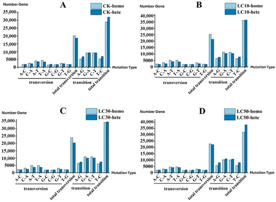 Numbers of different SNP mutation types ((A):the number of SNP mutation types under the CK; (B): the number of SNP mutation types under the LC10; (C): the number of SNP mutation types under the LC30; (D): the number of SNP mutation types under the LC50) (CK-homo: CK-homozygous; CK-hete: CK-heterozygous; LC10-homo: LC10-homozygous; LC10-hete: LC10-heterozygous; LC30-homo: LC30-homozygous: LC30-hete: LC30-heterozygous; LC50-homo: LC50-homozygous: LC50-hete: LC50-heterozygous).