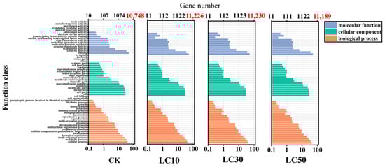 A total of 37,626 transcripts with SNP-transcripts were annotated in the GO database, with 13,974 (37.14%) successful annotations. The control group and each treatment group were analyzed in terms of the three main functional categories of GO. The types of the annotated items in each treatment group were the same, but the gene quantities might vary. Most abundant was the biological process (annotated to include 22 secondary classifications, accounting for 40.0%), followed by the cellular component (annotated to include 18 secondary classifications, accounting for 32.73%), and molecular function (annotated to include 15 secondary classifications, accounting for 27.27%). There were 10,748 SNP-transcripts annotated in the CK, with the most annotated function being binding with 5422 (50.45%), followed by cellular process with 4459 (41.49%), metabolic process with 3840 (35.73%), and catalytic activity with 3782 (35.19%). In the LC10 treatment group, there were 11,226 annotations, with the most annotated function being binding with 5668 (50.49%), followed by cellular process with 4674 (41.64%), metabolic process with 4022 (35.83%), and catalytic activity with 3933 (35.03%). In the LC30 treatment group, there were 11,230 annotations, with the most annotated function being binding with 5632 (50.15%), followed by cellular process with 4657 (41.47%), metabolic process with 3991 (35.54%), and catalytic activity with 3920 (34.91%). In the LC50 treatment group, there were 11,189 annotations, with the most annotated function being binding with 5673 (50.70%), followed by cellular process with 4672 (41.76%), metabolic process with 3993 (35.69%), and catalytic activity with 3911 (35.69%) (Figure 5). The results showed that, through the GO functional classification of the SNP-transcripts in the control group and each treatment group, the biological process pathway had the highest proportion of gene numbers, with the cellular process pathway having the most gene numbers in its secondary classification, followed by the cellular component pathway, with the cell and cell part pathways having the most numbers in its secondary classification, and the molecular function pathway, with the binding pathway having the most gene numbers. However, in terms of quantity proportion, the number of enriched genes in each GO item under the stress of the pesticide mixture treatment was greater than that of the CK (Figure S4).
