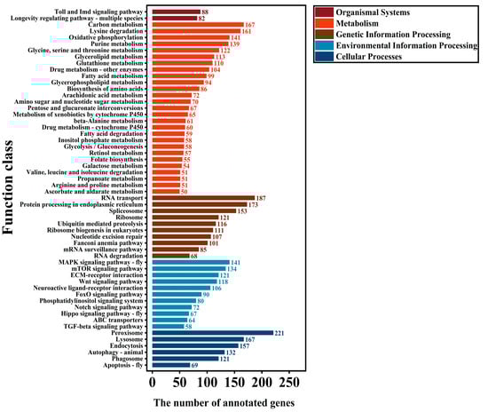 A more detailed classification analysis of gene function was conducted. Metabolism featured 90 secondary categorization processes, and there was a significant variation in the number of annotations. Secondary classification results revealed that SSR-transcripts related to lysine degradation and fatty acid metabolism had the highest number of annotations, constituting 4.05% and 3.78% of KEGG-annotated SSR-transcripts, respectively. The fewest annotations were identified in penicillin and cephalosporin biosynthesis, glycosphingolipid biosynthesis-ganglio series, D-arginine and D-ornithine metabolism, and biotin metabolism, with only one SSR-transcript annotated. Organismal systems encompassed 38 secondary classifications, with the Toll and Imd signaling pathways containing the most SSR-transcripts, accounting for 1.88% of KEGG-annotated SSR-transcripts. Processing included 22 secondary classifications, with RNA transport and protein processing in the endoplasmic reticulum having the greatest number of SSR-transcripts, comprising 5.56% (272) and 5.46% (267) of KEGG-annotated SSR-transcripts, respectively. Human diseases featured 20 secondary classifications, with salmonella infection having the most annotations, while the minimum number was only one. Cellular processes included 16 secondary classifications, with autophagy in animals having the most annotations, representing 5.13% (251) of KEGG-annotated SSR-transcripts. Environmental information processing was divided into 26 secondary classifications, with the MAPK signaling pathway-fly having the largest number of annotations, constituting 3.46% (173) of the KEGG-annotated SSR-transcripts (Figure S3).