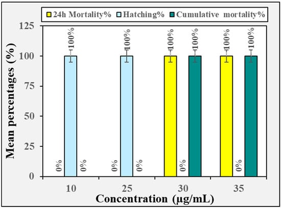 The extracts showing the highest larvicidal activity against mosquito larvae underwent toxicological testing. The wild-type strain of zebrafish was reared and maintained at the Bioproducts Research Chair, Department of Zoology, King Saud University, at 28 °C and photoperiod of 14 light:10 dark. The embryotoxicity assessment of the zebrafish was conducted following the method described by Abutaha et al. [33] with a slight modification. Zebrafish embryos were exposed to various concentrations of crude methanolic extract of marine sponge and its derived fractions in a 12-well plate, with a DMSO and Triton X-100 mixture serving as the control. Each well consisted of three embryos and the experiment was performed in triplicate. The plates were maintained at a constant temperature of 28 °C. Observations on embryo mortality (defined by coagulation and the absence of a heartbeat), hatchability, and malformations were made at 24, 48, and 72 h post-treatment using a dissection microscope. Images were captured using an Olympus SZ10 Stereo microscope fitted with a DP72 camera (Tokyo, Japan) and analyzed by the CellsSense standard (Olympus) software (version 3.2). The biosafety index (BI) is determined using the formula established by Moungthipmalai et al. [34] to evaluate the potential toxicity associated with the marine sponge extracts under investigation.