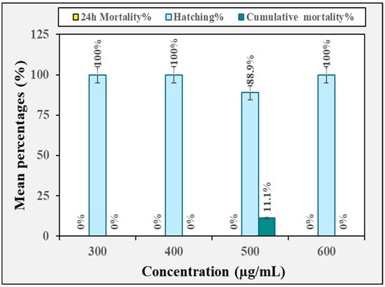 The toxicological effect of the crude methanolic extract of H. erectus and its fraction on zebrafish embryos is displayed in Figure 2, Figure 3, Figure 4, Figure 5 and Figure 6. The crude methanolic extract showed a concentration-dependent response of zebrafish embryo toxicity towards H. erectus crude and solvent fractions. There was a direct correlation between increasing extract concentrations and greater mortality percentages among the embryos, ranging from 22.2% at the lowest concentration to a complete mortality percentage of 100% at the highest concentration after 72 h of exposure (Figure 2). This increase in toxicity corresponded with reduced hatching percentages across all the tested concentrations, with the group exposed to 1000 µg/mL showing no successful hatching. The n-hexane fraction demonstrated a clear distinction in embryonic mortality and hatching success between lower and higher concentration groups (Figure 3). No mortality was observed at the lower concentrations of 10 and 25 µg/mL, and all the embryos hatched successfully. In contrast, a significant increase in mortality percentages was observed in the embryos exposed to higher extract concentrations, particularly at 30 and 35 µg/mL, where the mortality percentage reached 100%. Conversely, the survival of the zebrafish embryos was not adversely affected by the chloroform fraction across the tested concentration range of 300 to 600 µg/mL (Figure 4). Remarkably, all the chloroform fraction concentrations demonstrated a complete hatching rate, indicating that the extract does not pose a significant threat to embryo survival within this range. However, it is noteworthy that at the concentration of 500 µg/mL, a slight decrease in the hatching percentage was observed, with 88.9% of the embryos successfully hatching. The n-butanol fraction had variable impacts on zebrafish embryos depending on the concentration administered (Figure 5). No adverse effects were observed at 300 µg/mL, with a complete hatching percentage of the embryos. However, when the concentration was increased to 400 µg/mL, a notable mortality rate of 22.2% was recorded, indicating that this concentration begins to exert detrimental effects on embryo survival. Further increases in concentration to 500 µg/mL and 600 µg/mL resulted in an identical mortality percentage of 44.4%, suggesting a significant escalation in toxicity at these higher levels. The consistent mortality rate at both concentrations implies that the embryos experience similar levels of toxicological impact, regardless of the slight increase in concentration. Overall, the hatching embryos developed normally with no observable differences in morphology or growth compared to the control group (Figure 6).
