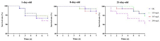 The survival rate of the workers of different ages (1-, 8-, and 21-day-old) in all the azoxystrobin treatment groups decreased continuously with exposure time (Figure 1). Compared to 8-day-old workers, the 1- and 21-day-old workers had a poor tolerance to azoxystrobin, and the survival rates of them in each treatment group were lower than that of the 8-day-old workers. However, no significant differences in the survival rate of the workers (1-, 8-, and 21-day-old) were found between different the concentration treatment groups and the CK (Log-rank (Mantel–Cox) test, for 1-day-old workers, x2 = 0.1471, df = 3, p = 0.9856; for 8-day-old workers, x2 = 1.018, df = 3, p = 0.7970; for 21-day-old workers, x2 = 2.783, df = 3, p = 0.4262).