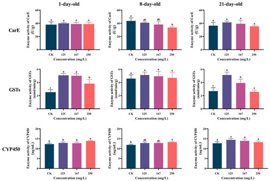 Effect of azoxystrobin on activities of detoxification enzymes (CarE, GSTs and CYP450) in worker bees of different ages. Data on concentration in figure expressed as mean ± SE (standard error). Different letters mean significant differences among different exposure treatments (Tukey’s multiple comparison tests, p < 0.05).