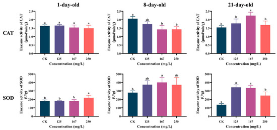 Azoxystrobin inhibited CAT activity in both 1- and 8-day-old workers, but no significant difference between the CK and treatment groups for the 1-day-old workers was found (one-way ANOVA, F(3,12) = 1.487, p = 0.2677; Figure 3), while the CAT activity of the 8-day-old workers was obviously decreased in the 167 and 250 mg/L groups (F(3,12) = 12.14, p = 0.0006). In the 21-day-old workers, the CAT activity increased in the azoxystrobin treatment groups, with a significant rise in the 167 mg/L group (F(3,12) = 6.663, p = 0.0025). The SOD activity in these workers increased with azoxystrobin exposure, but the effect varied with concentration and age. Among the groups, the SOD activity of the 21-day-old workers was significantly increased with azoxystrobin stress (F(3,11) = 43.40, p < 0.0001). This was not the case for the 1- and 8-day-old workers; the significant effect on 1-day-old workers was only in the 250 mg/L group (F(3,11) = 4.343, p = 0.0452), while for 8-day-old workers it was only in the 167 mg/L group (F(3,10) = 4.3470, p = 0.0489).