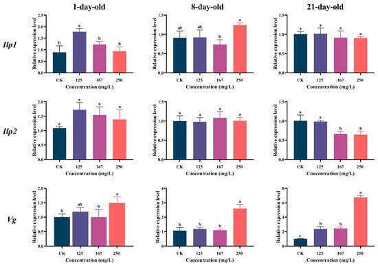 The expression levels of three nutrition genes (Ilp1, Ilp2, and Vg) in the 1-day-old workers were increased by azoxystrobin stress. The expression of Ilp1 was significantly increased only in the 125 mg/L group (one-way ANOVA, F(3,9) = 13.76, p = 0.0010; Figure 5) and that of Vg was only increased in the 250 mg/L group (F(3,8) = 5.025, p = 0.0302), while the expression of Ilp2 was upregulated, but no statistically significant difference was observed (F(3,8) = 3.362, p = 0.0756). Both Ilp1 and Ilp2 were downregulated in the 21-day-old workers, and their levels gradually decreased with the increasing concentrations of azoxystrobin treatment (for Ilp1, F(3,8) = 0.6714, p = 0.5932; for Ilp2, F(3,8) = 15.12, p = 0.0007). Azoxystrobin could induce the expression of Vg with a significant concentration effect (F(3,10) = 314.6, p < 0.0001). In the 8-day-old workers, the three nutrition genes were upregulated in the 250 mg/L group, but only Vg showed a significant difference compared to the CK (for Ilp1, F(3,10)= 6.593, p = 0.0098; for Ilp2, F(3,9) = 0.3983, p = 0.7576; for Vg, F(3,8) = 44.41, p < 0.0001).