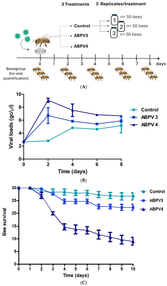 ABPV infection in adult bees. (A) Graphic representation of the experimental design. The treatments were: ABPV4: 104 cg/μL; ABPV3: 103 cg/μL; Control: without virus. (B) Viral loads (log genome copies/μL;) over time for each treatment (triangles: ABPV4, 104 gc/μL; squares: ABPV3, 103 gc/μL, and circles: control without virus). (C) Analysis of bee survival rate based on the number of live bees per glass jar across treatments and days of the experiment (triangles: ABPV4, 104 cg/μL; squares: ABPV3, 103 cg/μL and circles: control without virus).