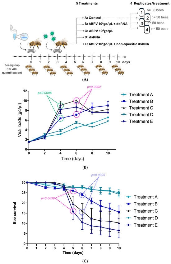 The experimental design is shown in Figure 2A. On day 4 (1-day post-infection), an exponential increase in average VLs was observed in treatments C (ABPV 104 gc/μL) and E (ABPV 104 gc/μL + non-specific dsRNA). In treatment B, which included the administration of specific dsRNA (ABPV 104 gc/μL + dsRNA), VLs were significantly lower than those in treatments C (p = 0.0006) and E (p = 0.0306). Significant differences were also observed on day 6 between treatments B and C (p = 0.0002) (Figure 2B).