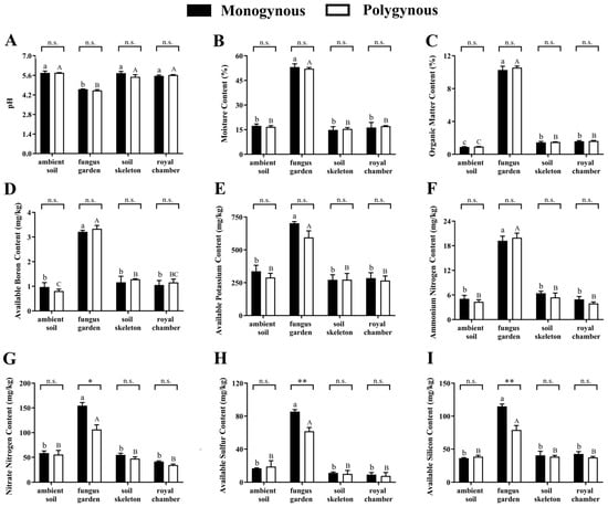 Soil physicochemical properties (mean ± SE, n = 3) across nest parts in both monogynous and polygynous colonies of Macrotermes barneyi. (A) pH, (B) moisture content, (C) organic matter content, (D) available boron content, (E) available potassium content, (F) ammonium nitrogen content, (G) nitrate nitrogen content, (H) available sulfur content, (I) available silicon content. Different lowercase and uppercase letters on the tops of columns indicate significant differences among nest parts in monogynous and polygynous colonies, respectively (p < 0.05). Asterisks represent significant differences (* p < 0.05, ** p < 0.01); n.s. represents no significant difference.