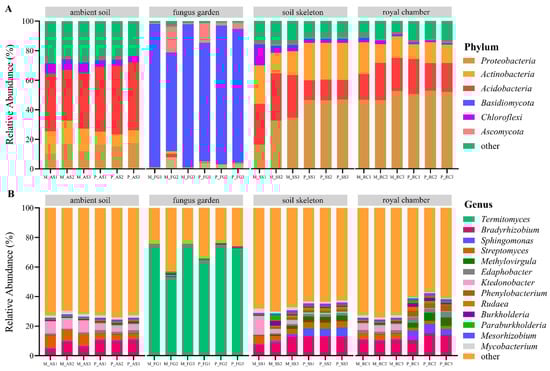 At the kingdom level, all soil samples consisted of Bacteria, Eukaryotes, and Archaea. The specific proportions for ambient soil were 98.10% Bacteria, 1.81% Archaea, and 0.09% Eukaryotes; for the fungus garden, they were 94.29% Eukaryotes, 5.70% Bacteria, and 0.01% Archaea; for the soil skeleton, they were 98.92% Bacteria, 0.56% Eukaryotes, and 0.52% Archaea; and for the royal chamber, they were 99.46% Bacteria, 0.38% Eukaryotes, and 0.16% Archaea. A total of 185 phyla and 4249 genera were identified. At the phylum level, there were four phyla with average relative abundances above 10% (Figure 3A), which were Proteobacteria (26.31%), Basidiomycota (21.94%), Acidobacteria (21.15%), and Actinobacteria (12.13%), respectively. At the genus level, there were a total of 13 genera with an average relative abundance above 1% (Figure 3B), which were Termitomyces (17.35%), Bradyrhizobium (8.32%), Streptomyces (3.13%), Ktedonobacter (2.53%), Sphingomonas (2.15%), Methylovirgula (1.88%), Edaphobacter (1.46%), Phenylobacterium (1.16%), Paraburkholderia (1.09%), Mycobacterium (1.05%), Rudaea (1.04%), Mesorhizobium (1.03%), and Burkholderia (1.00%), respectively.
