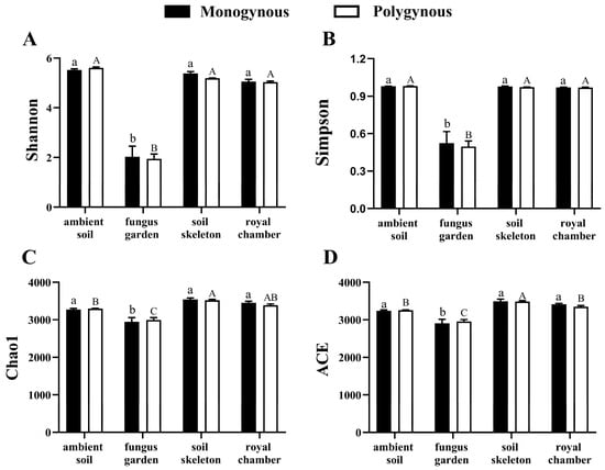 Microbial community diversity across nest parts in both monogynous and polygynous colonies of Macrotermes barneyi. Different lowercase and uppercase letters on the tops of columns indicate significant differences among nest parts in monogynous and polygynous colonies, respectively (p < 0.05). (A) Shannon index; (B) Simpson index; (C) Chao1 index; (D) ACE index.