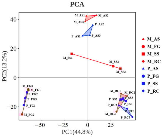 The microbial α-diversity in the fungus garden of both monogynous and polygynous colonies was lower than that in other nest parts (Figure 4). The richness of the microbial community in the colony was not significantly affected by the breeding system (Chao1: F = 0.006, p = 0.939; ACE: F = 0.028, p = 0.870) or by its interaction with the nest part (Chao1: F = 0.460, p = 0.714; ACE: F = 0.684, p = 0.575), but varied significantly across nest parts (Chao1: F = 42.450, p < 0.001; ACE: F = 39.535, p < 0.001). The diversity indices of the microbial community in the colony were not significantly affected by the breeding system (Shannon: F = 0.197, p = 0.663; Simpson: F = 0.082, p = 0.779) or by its interaction with the nest part (Shannon: F = 0.232, p = 0.873; Simpson: F = 0.063, p = 0.978), but varied significantly across nest parts (Shannon: F = 183.689, p < 0.001; Simpson: F = 80.939, p < 0.001). Principal component analysis (PCA) showed that the soil skeleton and ambient soil were distinct from each other between the monogynous and polygynous colonies (Figure 5).