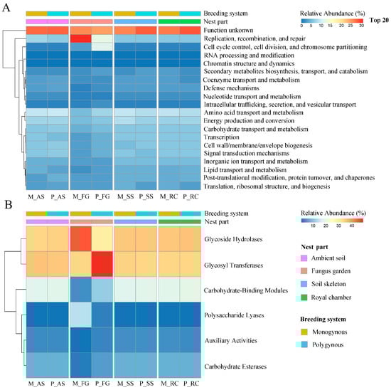 Functional annotation of the soil microbial communities across nest parts in both monogynous and polygynous colonies of Macrotermes barneyi. (A) Top 20 eggNOG; (B) CAZys.