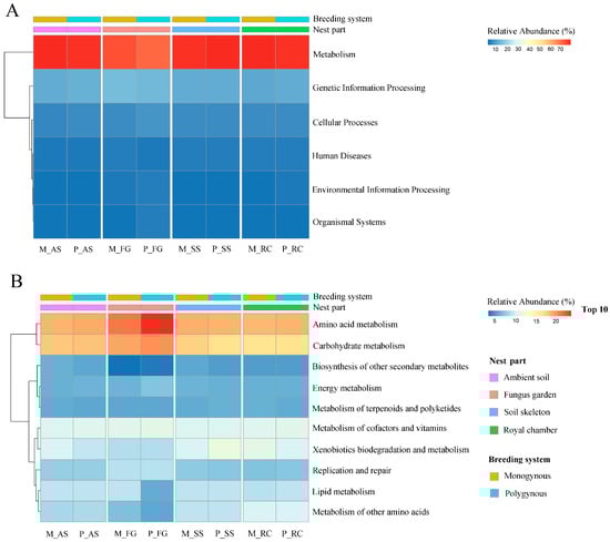 Among all annotated pathways at KEGG level 1, the pathways “metabolism” and “genetic information processing” (Figure 7A) were the only ones with a relative abundance exceeding 10%. The relative abundance of both “metabolism” and “genetic information processing” in the colony was not significantly affected by the breeding system (F = 0.491, p = 0.494; F = 0.649, p = 0.432, respectively) or by its interaction with the nest part (F = 0.226, p = 0.877; F = 0.618, p = 0.613, respectively), but varied significantly across nest parts (F = 21.176, p < 0.001; F = 11.129, p < 0.001, respectively).