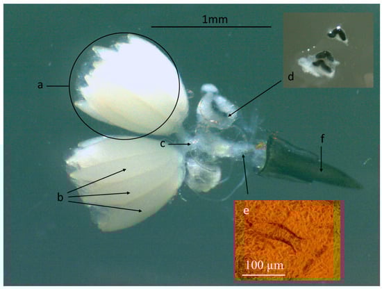 Females of S. adipata have two ovoid-shaped translucent white ovaries with a mean (±SE) cross-sectional area of 0.767 ± 0.060 mm2 and are surrounded by grey filamentous tissue (Figure 1). Each ovary comprises an average of 11.12 ± 1.40 oocytes of mean length 862 ± 28 µm and width 214 ± 6 µm (labeled a in Figure 1). Each oocyte has a cross-section area of 0.142 ± 0.007 mm2. The oocytes are white, fusiform and are visible through the outer tissue of the ovary (labeled b in Figure 1). Oocytes connect to individual oviducts and then to a common oviduct (c in Figure 1). Females have three spermathecas located at the edges of the common oviduct, two of them paired and one placed individually (d in Figure 1). The spermathecas are black, sigmoidal and are covered by a whitish translucent spermathecal capsule. Within the common section of the oviduct, a sclerotized structure with a series of comb-like projections along its edges was identified. This structure appears to have an opening oriented toward the ovipositor. Based on its location and morphology, it is likely a signum (e in Figure 1). The signum is a sclerotized structure found in the female reproductive tract of certain arthropods that plays a significant role in reproduction, although its shape and size can vary considerably among species. The ovipositor measures 994 ± 58 µm in length and is lance shaped with an aperture that runs from the base to the lower tip (f in Figure 1). The ovipositor is black and covered by sclerotized chitin over its entire length.