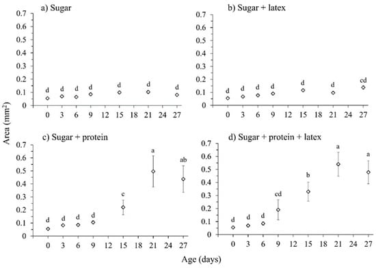 Mean area of both ovaries (±SE) in females aged 0, 3, 6, 9, 15, 21 and 27 d, that fed diets of (a) sugar, (b) sugar with latex, (c) sugar with protein and (d) sugar with protein and latex. Data points labeled with different letters differ significantly for comparisons among all diet treatments and female age (GLM, Bonferroni test, p < 0.05).