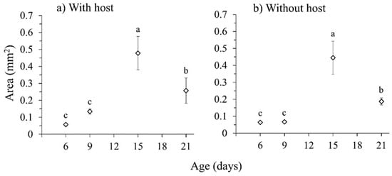 Mean ovarian area (±SE) at 6, 9, 15, and 21 d in the (a) presence and (b) absence of a fig host. Data points with different letters indicate significant differences for comparisons within each treatment (GLM, Bonferroni’s test, p < 0.05).