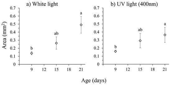 Mean ovarian area (±SE) in females of different ages reared under (a) white light and (b) white light supplemented with UV-A (400 nm). Data points with different letters indicate significant differences for comparisons within each treatment (GLM, Bonferroni’s test, p < 0.05).