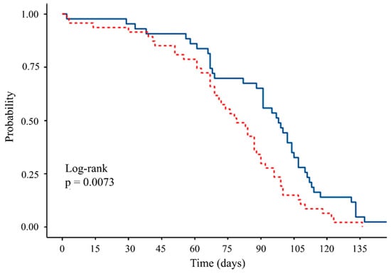 A total of 43 females and 47 males were monitored across the five replicate cages for the duration of the experiment while offered a diet of sugar + hydrolyzed protein. Median survival time was lower for males (79 d, 95% CI = 69–90 d) than for females (98 d, 95% CI = 91–107 d) (Kaplan–Meier log-rank test, p = 0.007) (Figure 8).