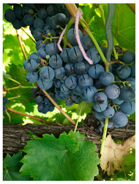 For each experimental cultivar, five plants were selected in two separate rows, and five clusters were designated for berry collection. Each cluster, consisting of a compact group of berries developing from a single inflorescence, served as a unit for berry injury. Within each designated cluster, several individual berries were manually injured, and the clusters were marked for identification (Figure 1).