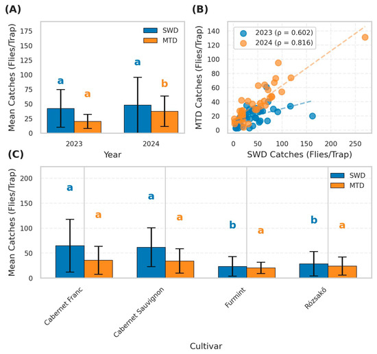 Summary of insect trap catch data comparing spotted wing Drosophila (SWD) and melanogaster-type Drosophila (MTD) across years and cultivars. (A) Bar plot comparing mean catches (flies/trap) of SWD and MTD in 2023 and 2024, with error bars representing standard deviation (SD). Different letters above bars indicate statistically significant differences between years for each species (p < 0.05). MTD catches differed significantly between years (‘a’ and ‘b’), while SWD catches did not (both marked ‘a’). (B) Scatter plot showing the correlation between SWD and MTD catches for 2023 and 2024, with Spearman’s rank correlation coefficients (ρ = 0.602 for 2023; ρ = 0.816 for 2024) and fitted regression lines (dashed). (C) Bar plot comparing mean catches (± SD) of SWD and MTD across four grape cultivars (Cabernet Franc, Cabernet Sauvignon, Furmint, and Rózsakő). Different letters above bars indicate statistically significant differences between cultivars for each species separately (p < 0.05).