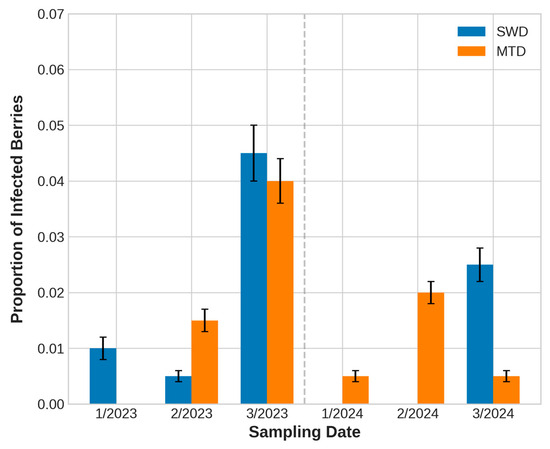 In 2023, the proportion of SWD-infected berries increased from 1.0% noted on the first sampling date to 4.5% on the third, while MTD infestation rose from 0% to 1.5%, peaking at 4.0% on the third sampling date (χ2 = 9.69, p = 0.0079 for SWD; χ2 = 9.08, p = 0.0107 for MTD) (Figure 3).