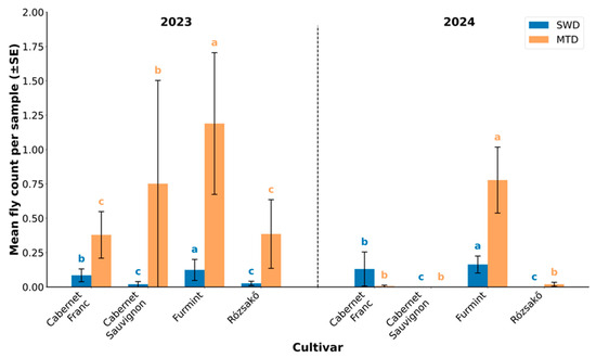 Mean fly count per sample for spotted wing Drosophila (SWD) and melanogaster-type Drosophila (MTD) from unhurt pooled berries across different grape cultivars in 2023 and 2024. Different letters above bars indicate statistically significant differences among cultivars within each year and species (p < 0.05). Bars sharing the same letter are not significantly different. Error bars represent the standard error of the mean (±SE).