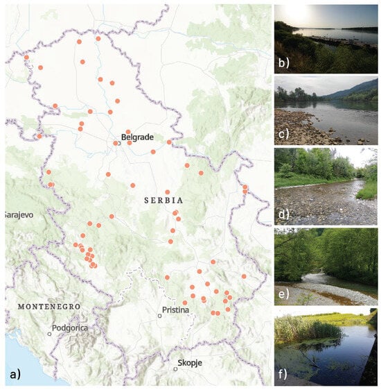 Study area with (a) the geographic position of 75 study sites across Serbia, and photo examples of study sites (b) WBT 1—large rivers with fine substrate (c) WBT 2—mix of large and medium rivers with coarse substrate (d) WBT 3—small watercourses with coarse substrate (e) WBT 4—small mountainous rivers and streams (f) WBT 5—slow flowing/stagnant waters (artificial canals and reservoirs).