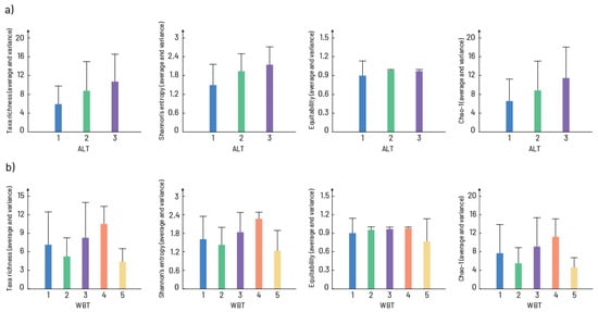 Alpha diversity and its components in relation to (a) altitude gradient (ALT: 1—study sites up to 500 m a.s.l.; 2—study sites from 500 to 1000 m a.s.l.; 3—study sites above 1000 m a.s.l.) and (b) waterbody types (WBT: 1—large rivers with fine substrate (silt, clay mud, and sand); 2—mix of large and medium rivers with coarse substrate (gravel, stones, and rocks); 3—small watercourses with coarse substrate; 4—small mountainous rivers and streams and 5—slow flowing/stagnant waters (artificial canals and reservoirs)). Bars represent average values while lines denote the variance in each group of communities.