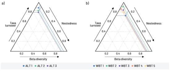 Beta diversity and its components in relation to (a) altitude gradient (ALT 1—study sites up to 500 m a.s.l.; ALT 2—study sites from 500 to 1000 m a.s.l.; ALT 3—study sites above 1000 m a.s.l.) and (b) waterbody types (WBT 1—large rivers with fine substrate (silt, clay mud, and sand); WBT 2—mix of large and medium rivers with coarse substrate (gravel, stones, and rocks); WBT 3—small watercourses with coarse substrate; WBT 4—small mountainous rivers and streams and WBT 5—slow flowing/stagnant waters (artificial canals and reservoirs)).