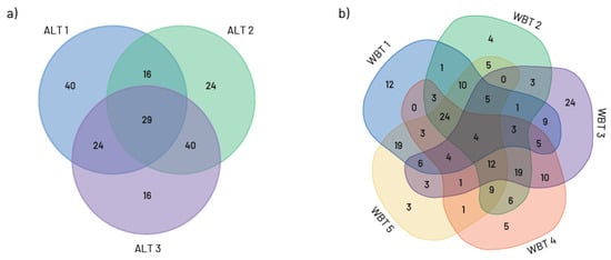 Number of taxa recorded in each study sites groups and the number of taxa shared among two or more groups of sites (a) altitudinal gradients (ALT 1—study sites up to 500 m a.s.l.; ALT 2—study sites from 500 to 1000 m a.s.l.; ALT 3—study sites above 1000 m a.s.l.) and (b) waterbody type (WBT 1—large rivers with fine substrate (silt, clay mud, and sand); WBT 2—mix of large and medium rivers with coarse substrate (gravel, stones, and rocks); WBT 3—small watercourses with coarse substrate; WBT 4—small mountainous rivers and streams and WBT 5—slow flowing/stagnant waters (artificial canals and reservoirs)).
